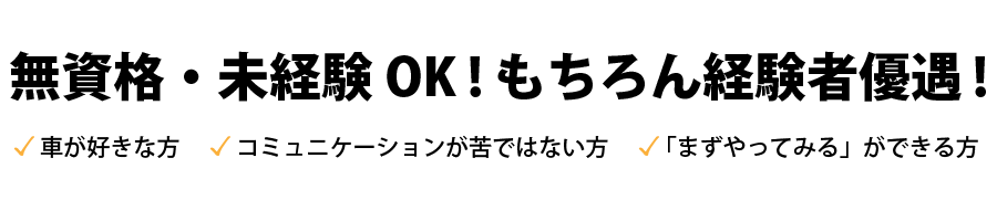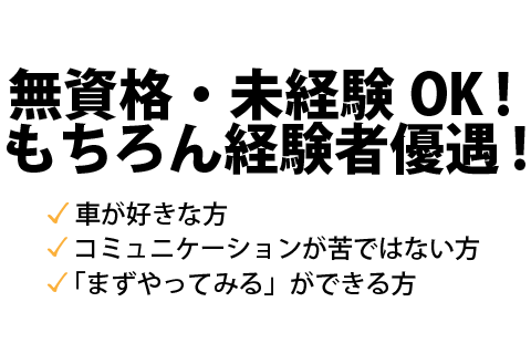 | 資格・経験 | 経験不問、要普通免許 (AT限定も可/MT優遇) 業界・職種未経験の方も大歓迎! ◎経験者優遇! 整備士免許なくてもOK! |